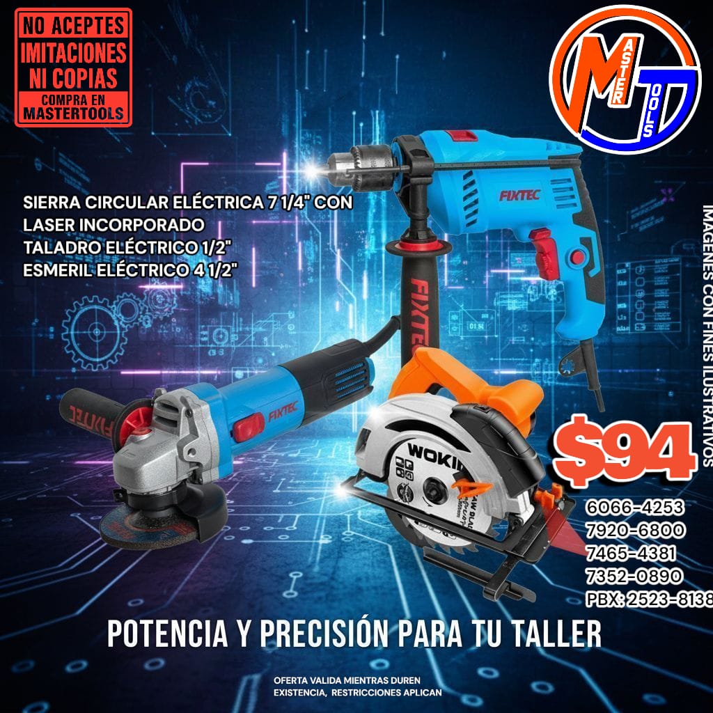 SIERRA CIRCULAR ELÉCTRICA 7 1/4″ CON LASER INCORPORADO, TALADRO ELÉCTRICO 1/2″, ESMERIL ELÉCTRICO 4 1/2″
